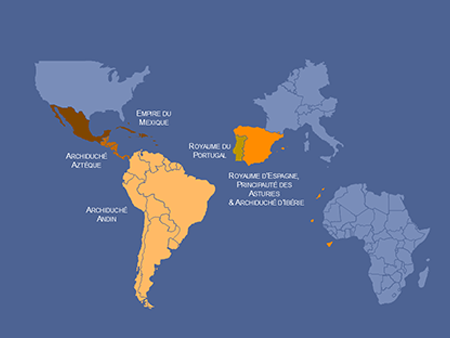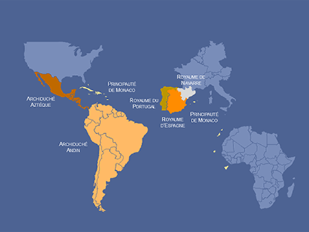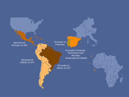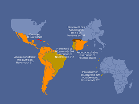 Le grand conflit mondial de 195 rebât les cartes. En Europe, le Roi Josèph d'Espagne crée l'Archiduché d'ibérie sur les frontières de la Navarre et la Principauté des Asturies, dont il conserve, néanmoins, la couronne, sur la partie nord-occidentale de la péninsule ibérique, reprenant, ainsi, des territoires acquis par les Portugais, en 168. Côté américain, les deux Archiduchés, Andin et Aztèque, demeurent mais l'Archiduché Aztèque perd une partie de son territoire qui prend son indépendance et s'empare des îles détenues par Monaco, pour constituer l'Empire du Mexique. En 224, le conflit qui n'a jamais cessé entre Aztèques et Mexicains se solde par la victoire des Aztèques qui récupèrent leurs territoires perdus ainsi que les îles et anéantissent l'Empire du Mexique. En 231, le Roi Luis d'Espagne s'empare de l'Archiduché des Andes sans parvenir à s'emparer de la totalité du territoire andin, le Brésil lui résistant et se consituant en un Royaume indépendant.